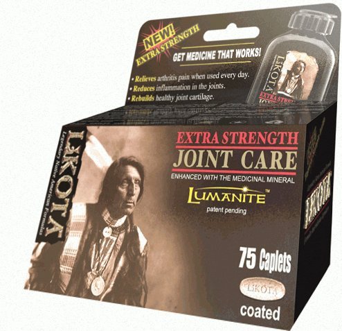 Lakota Extra Strength Joint Care Formula has even more potent pain-relieving extracts than the original Lakota Joint Care Formula. These additional extracts, combined with the medicinal mineral LumaniteTM, specifically target frequent and severe joint pain providing powerful, long-lasting relief. Joint Care Formula is a targeted multi-action natural source remedy for arthritis and joint pain.When used daily, this formula will provide you with the long-term benefit of healthy pain-free joints. It targets three different areas of arthritis at once:First, it provides fast pain relief. In our opinion, this is the number one thing that an arthritis product needs to address. If you don't control the pain then people stop flexing and using the problem joint. This can lead to even more pain and cartilage destruction. By controlling the pain, arthritis sufferers can continue to move the joint. This increases circulation to the problem area which helps bring blood and joint rebuilding nutrients into the joint. Second, Lakota Joint Care Formula does supplies the essential ingredients necessary to help increase joint lubrication. Extra lubrication reduces friction within the joint thereby helping to decrease further cartilage break down. This additional lubrication also helps reduce even more pain. Third, the Lakota Joint Care Formula provides your body with Collagen Type II. This is the primary ingredient in many scientific studies that is showing the greatest promise for REBUILDING and REPAIRING damaged joint cartilage. Lakota's proprietary Joint Care Formula contains natural source pain relievers and anti-inflammatories. These ingredients are combined with the nutrients in order to aid in cartilage repair in a convenient. single daily tablet or capsule that delivers powerful results.